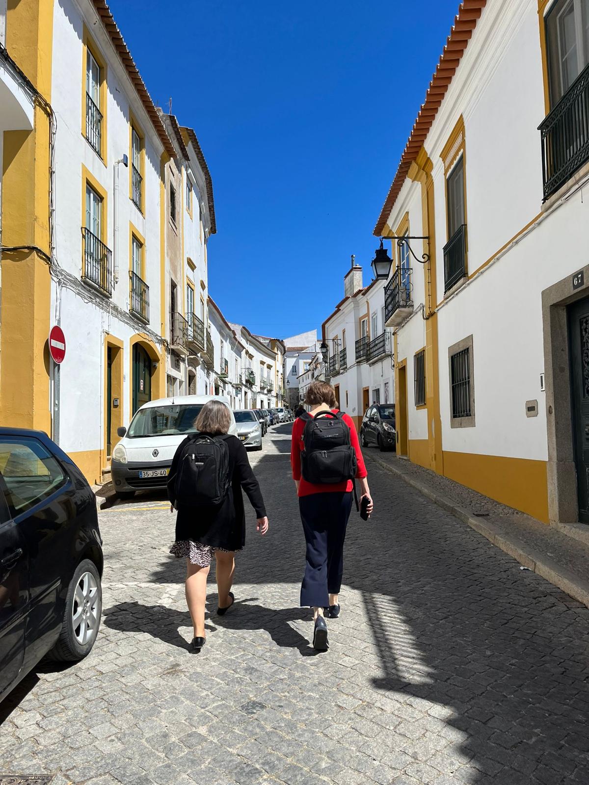 Image description (left to right): Dean of the School of the Arts University of Évora, Ana Telles, and ELIA Executive Director, Maria Hansen, walk through the historic streets of Évora, Portugal. ELIA Executive Director Maria Hansen, accompanied by conference manager Nona Thani, made their way to Évora to tend to final preparations in advance of ELIA Academy 2023. Last week, I had the opportunity to travel to Évora, Portugal for our final logistics visit there. Most of us arrived at Lisbon airport and then found our way to the small city of Évora, which is part of the Alentejo region and is about 1,5 hours south of Lisbon. Since there is no direct train connection from Lisbon airport, I first needed to take the underground to Lisbon Oriente station, and switch to the Évora train there. If anyone is worried about this as you prepare to attend the ELIA Academy 2023 in Évora, don’t be. Nothing could be easier. At Oriente, we took many stairs to suddenly find ourselves under the imposing yet intricate roof of the Oriente station, designed by architect Santiago Calatrava for the 1998 Expo in Lisbon.
