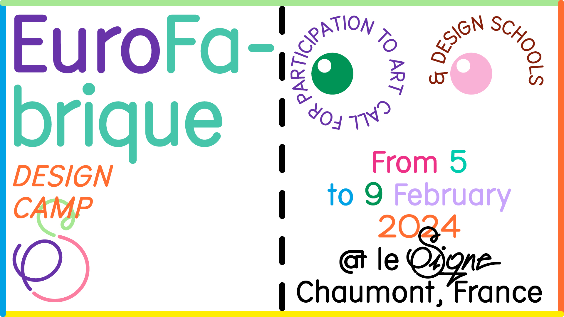 Call for participation for the EuroFabrique Design Camp! From 5-9 February 2024, le Signe, centre national du graphisme will host this second camp, a laboratory of workshops, masterclasses, lectures, and meetings combining theoretical approaches (fostered by guest speakers from the fields of philosophy, semiology, art direction) and design experimentation to lay the substratum for the visual identity of the continuing and evolving EuroFabrique. This week of in-person work will be followed by a month of remote work with weekly meetings facilitated by a graphic design studio. Based on the singular experience of the first EuroFabrique held at the Grand Palais in Paris in 2022 - and building on a further design camp to be held in Cluj Napoca in Romania in December 2023, the core values identified will be translated into a visual or multimedia representation. This laboratory will develop a repertory of graphic elements and a methodology that can be used by the stakeholders of the project in a dynamic yet recognizable and sensible visual language that reaches out through a clear and sound understanding of those shared values. The harmonisation and fine-tuning of this repertory will be ensured via the accompanied remote work with all the participants. The participants should plan to travel to Chaumont on Sunday 4 February and return home on Saturday 10 February 2024. The languages of the EuroFabrique Design Camp will be French and English. The deadline for submitting applications has been extended until: 12 November 2023 23:00 ECT Announcement of results: End of November Interested? Apply here! For further information and submission of applications, please contact Susanne Schroeder at etudiants@cndg.fr.