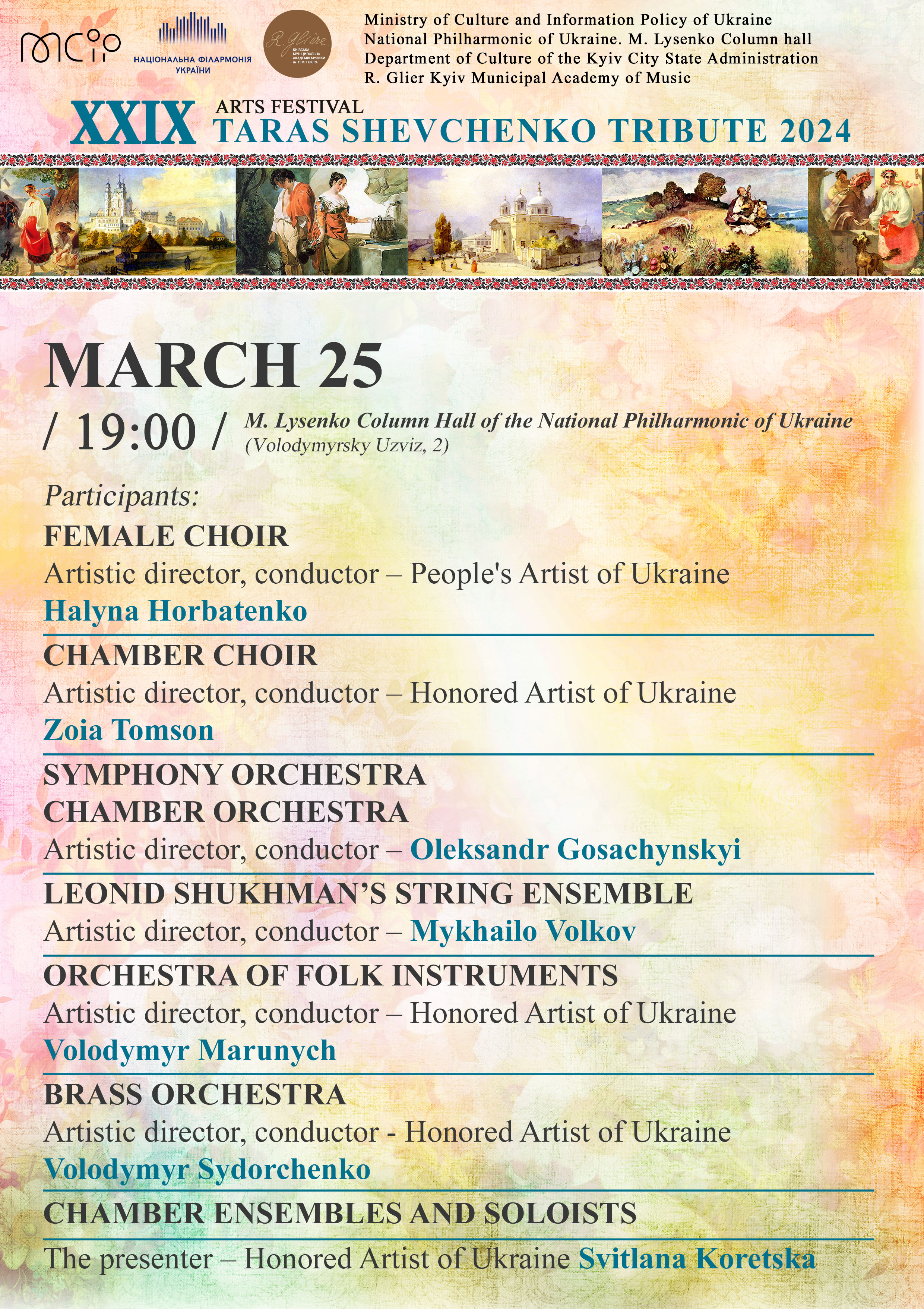 The concert of student choirs, orchestras and ensembles of the R. Glier Kyiv Municipal Academy of Music will take place in the M. Lysenko Column Hall of the National Philharmonic of Ukraine on 25 March 2024 at 19.00h. The participants include: - FEMALE CHOIR Artistic director, conductor - People's Artist of Ukraine Halyna Horbatenko