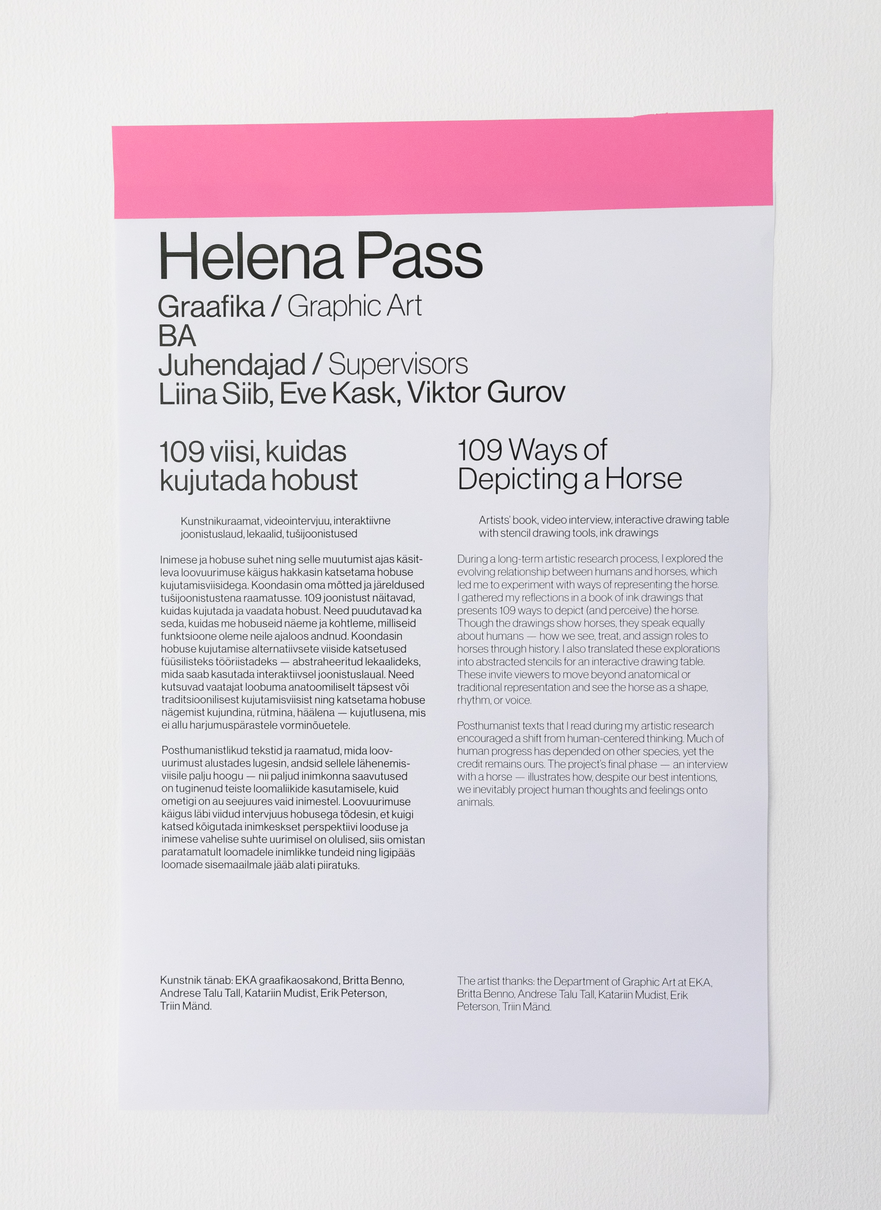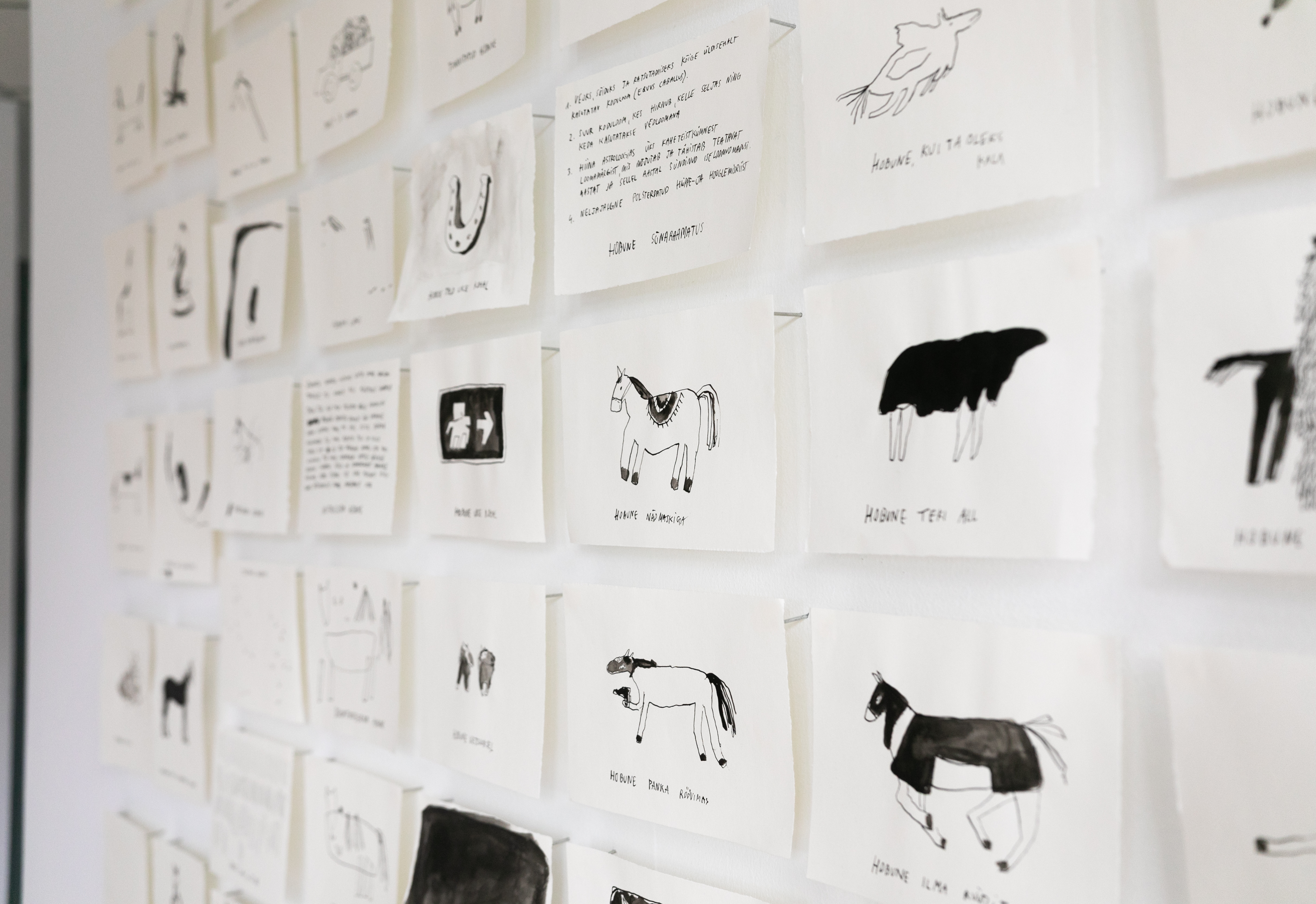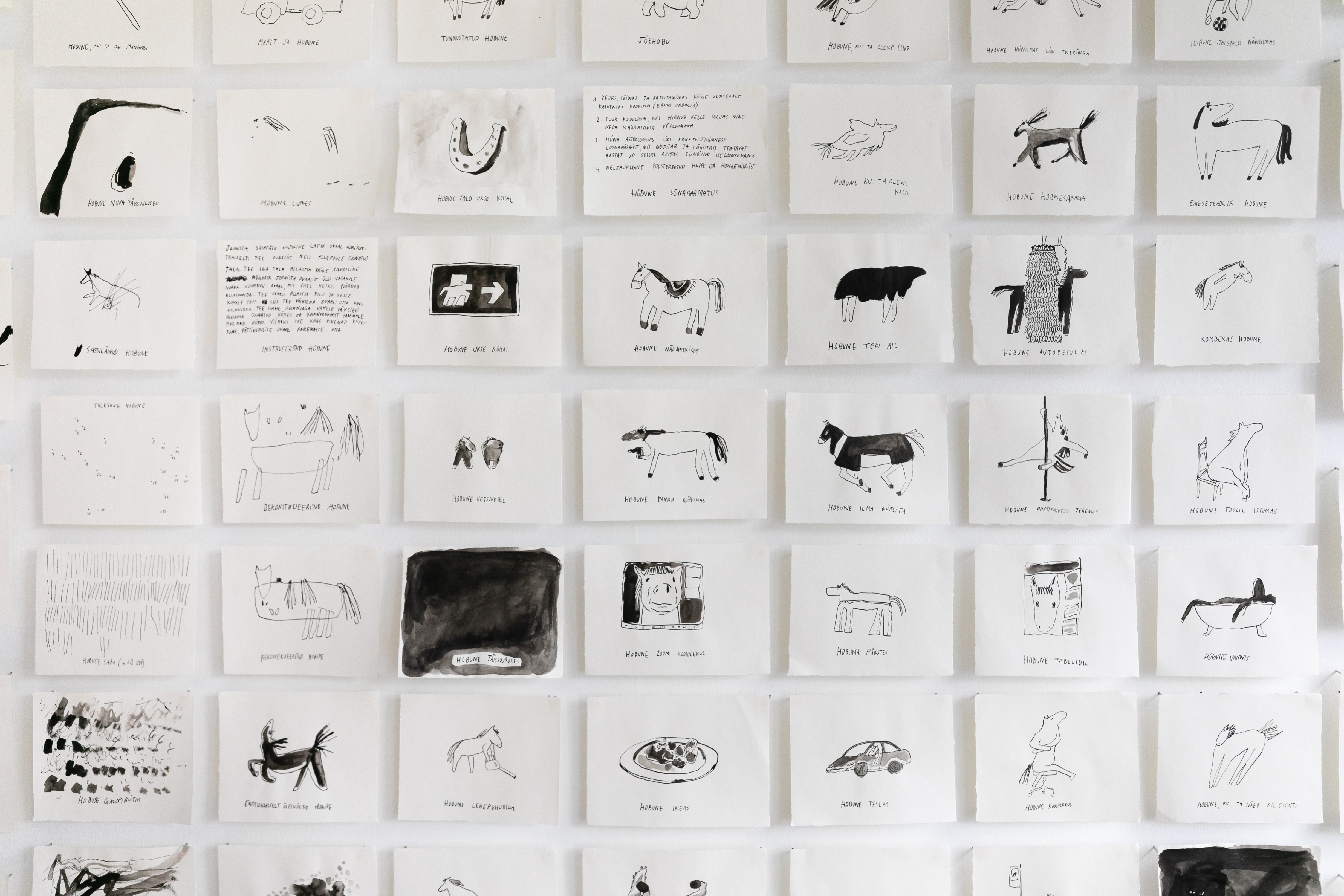 Photos by Helena Pass During a long-term artistic research process, I explored the evolving relationship between humans and horses, which led me to experiment with ways of representing the horse. I gathered my reflections in a book of ink drawings that presents 109 ways to depict (and perceive) the horse. Though the drawings show horses, they speak equally about humans — how we see, treat, and assign roles to horses through history. I also translated these explorations into abstracted stencils for an interactive drawing table. These invite viewers to move beyond anatomical or traditional representation and see the horse as a shape, rhythm, or voice. Posthumanist texts that I read during my artistic research encouraged a shift from human-centred thinking. Much of human progress has depended on other species, yet the credit remains ours. The project’s final phase — an interview with a horse — illustrates how, despite our best intentions, we inevitably project human thoughts and feelings onto animals. |