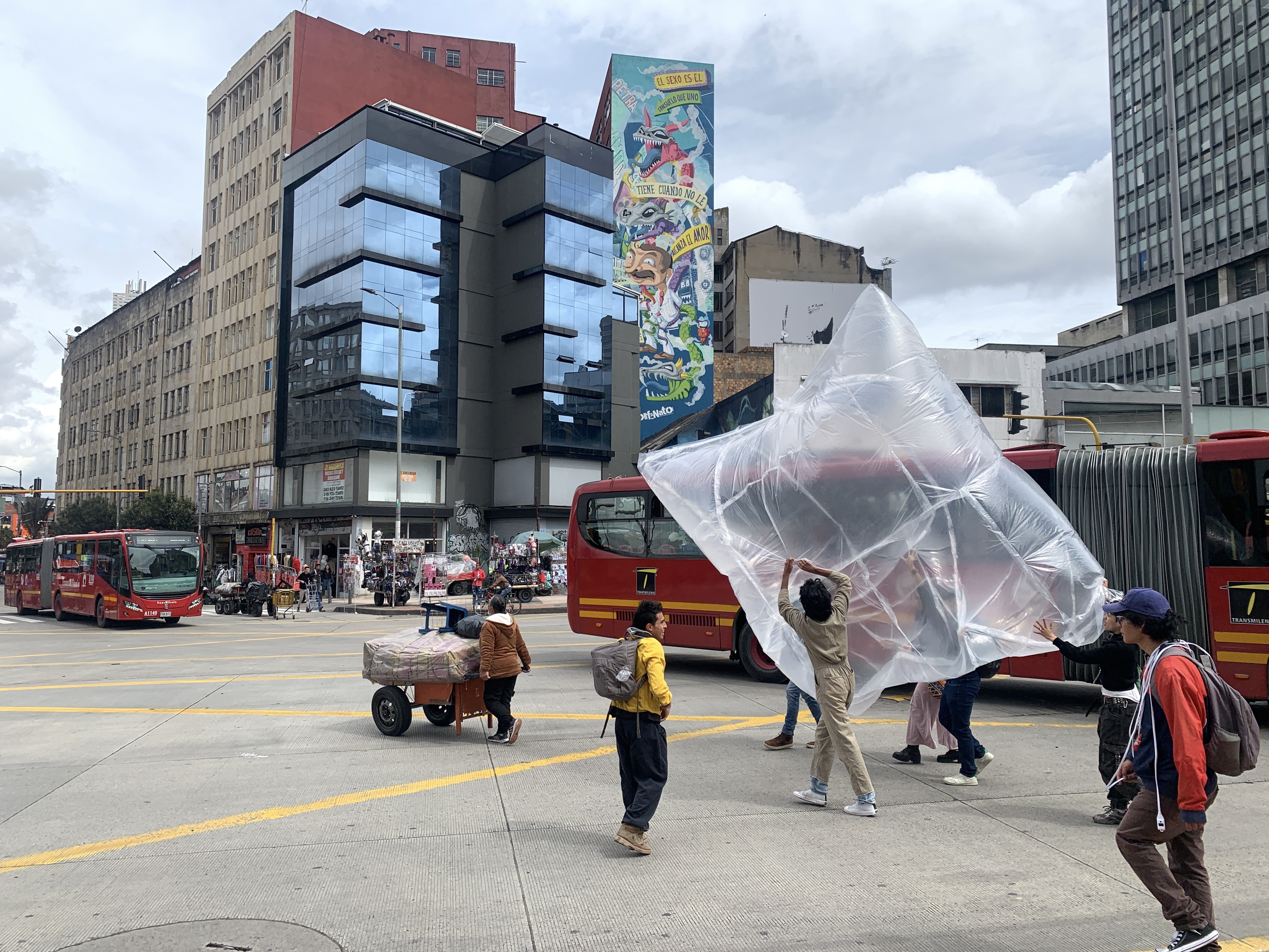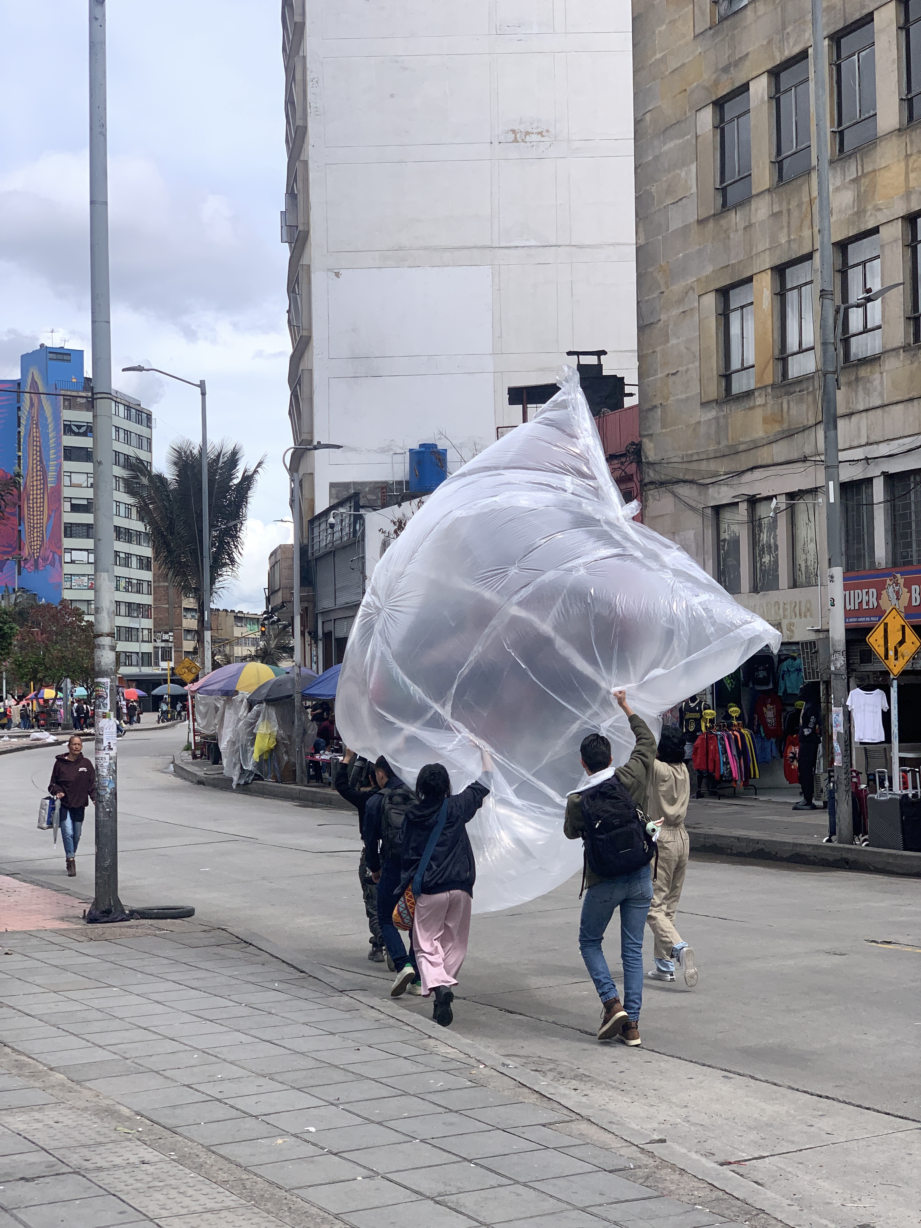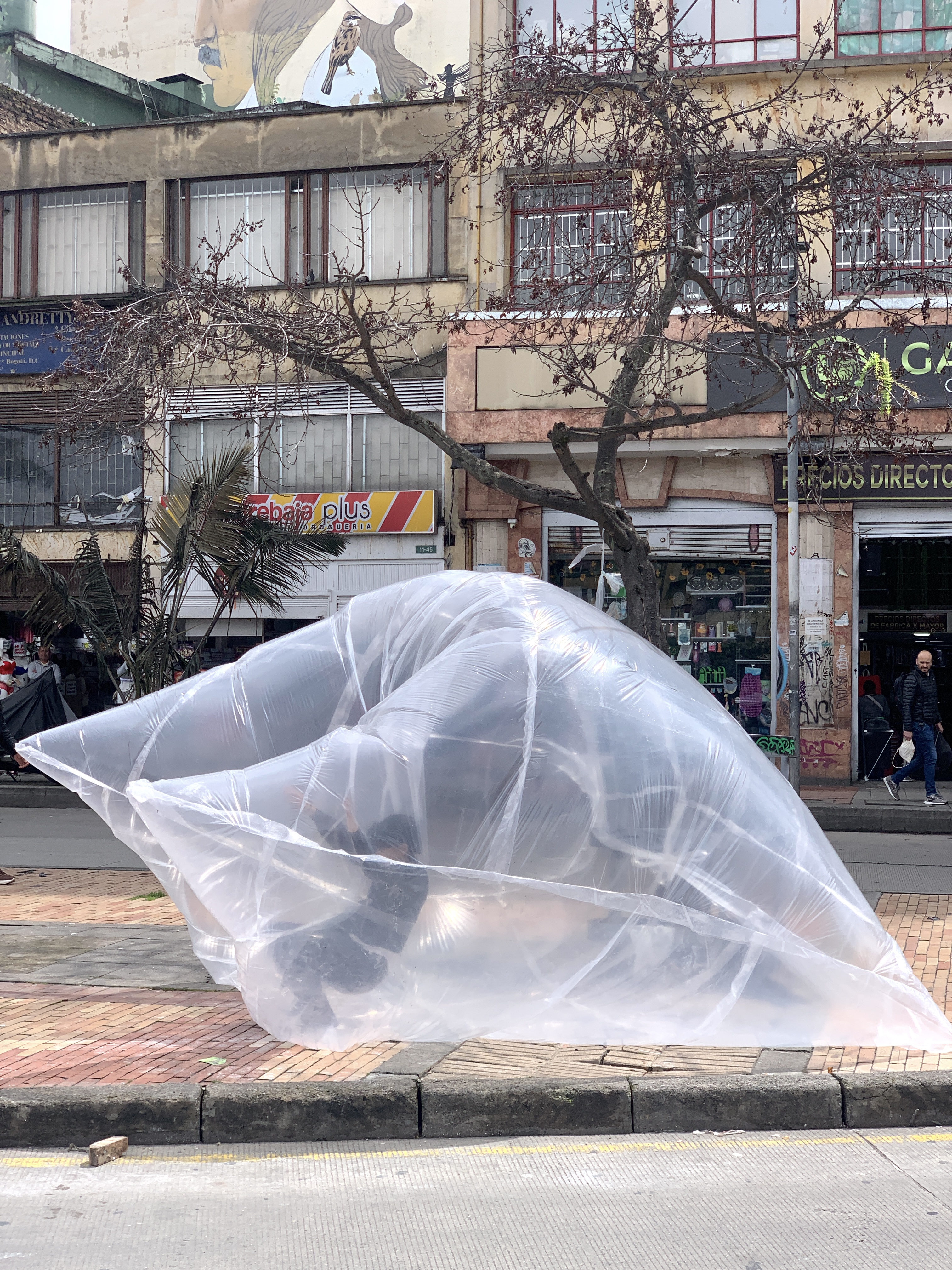 ![]() Johan Sebastian Rodríguez Blanco ENVOL-TURA Photos by Felipe Arturo and Students of the Arts and Space Workshop ENVOL-TURA is an inflatable sculpture constructed from reused plastic bags. Conceived for installation at a specific point in the city center where waste spontaneously accumulates, the piece maintains its bag-like form, composed of patchwork fragments that achieve a grand scale—a kind of mutant body that sustains and/or transforms with the wind, light, and the presence of passersby. This object seeks to intensify the relationship between refuse and form, between what is no longer desired and what can still breathe. Instead of concealing trash, the artwork reconfigures it, inflates it, rendering it visible from an alternative perspective. In dialogue with the urban landscape and in contrast to permanent sculptures like Negret's La Mariposa, ENVOL-TURA posits an aesthetic of the abject that does not reject its ephemeral condition. Rather, re-engaging with the philosophical notion of the landfill, it celebrates this condition as part of the city's vital cycle. |