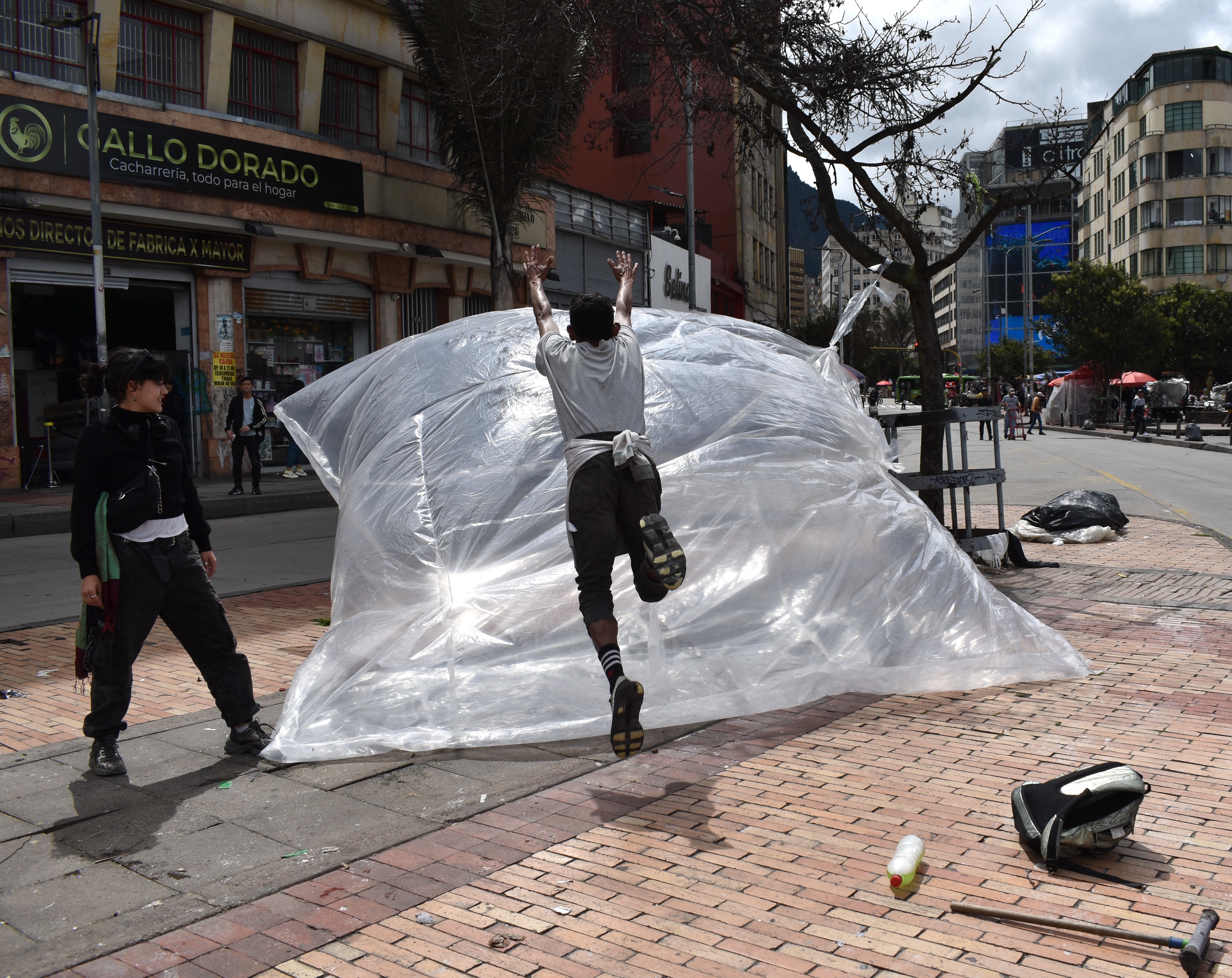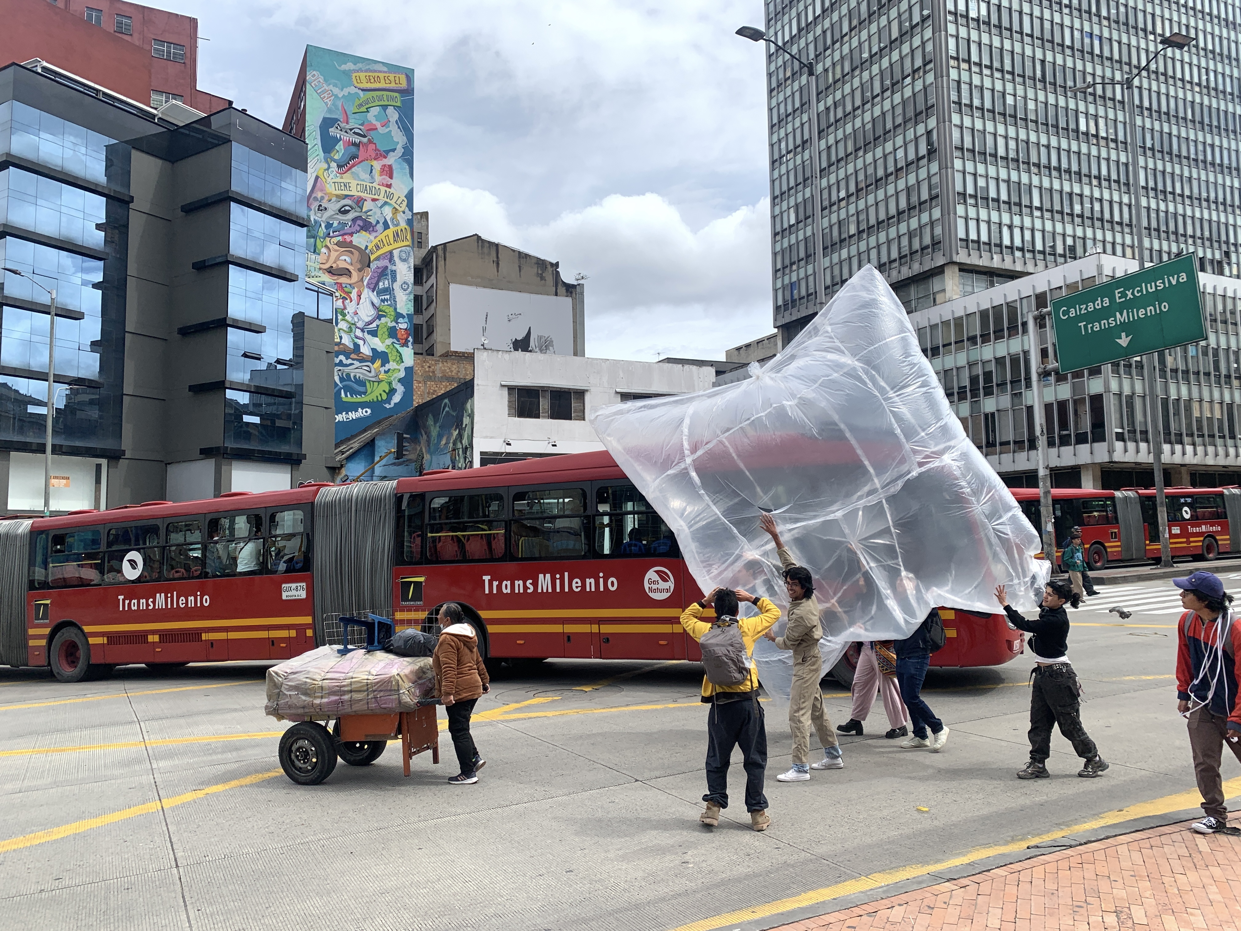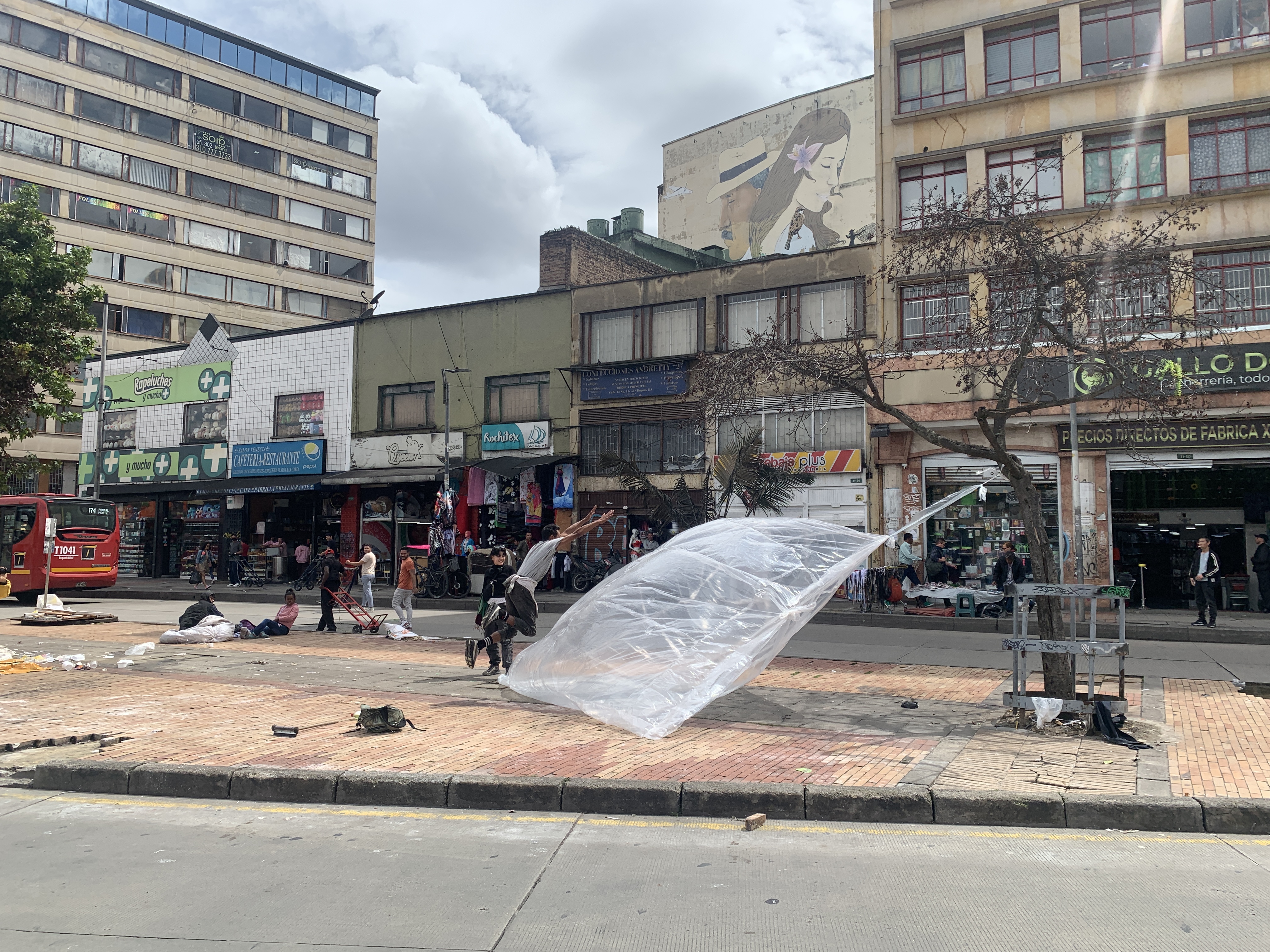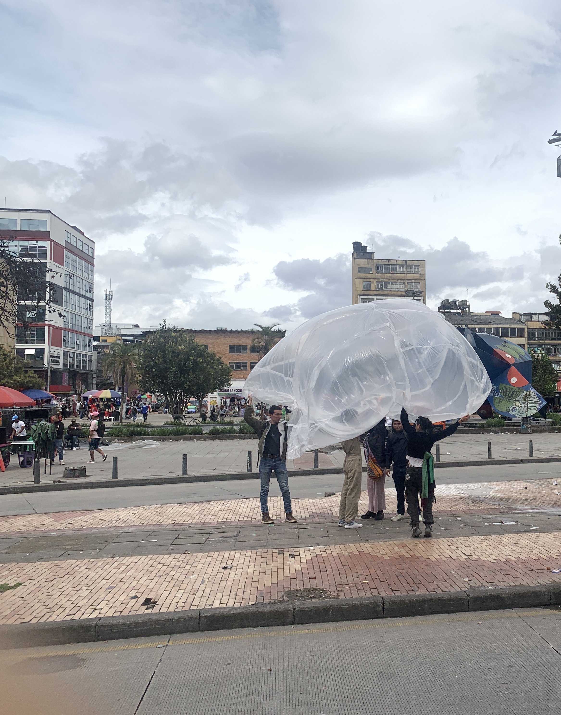 ![]() Johan Sebastian Rodríguez Blanco ENVOL-TURA Photos by Felipe Arturo and Students of the Arts and Space Workshop ENVOL-TURA is an inflatable sculpture constructed from reused plastic bags. Conceived for installation at a specific point in the city center where waste spontaneously accumulates, the piece maintains its bag-like form, composed of patchwork fragments that achieve a grand scale—a kind of mutant body that sustains and/or transforms with the wind, light, and the presence of passersby. This object seeks to intensify the relationship between refuse and form, between what is no longer desired and what can still breathe. Instead of concealing trash, the artwork reconfigures it, inflates it, rendering it visible from an alternative perspective. In dialogue with the urban landscape and in contrast to permanent sculptures like Negret's La Mariposa, ENVOL-TURA posits an aesthetic of the abject that does not reject its ephemeral condition. Rather, re-engaging with the philosophical notion of the landfill, it celebrates this condition as part of the city's vital cycle. |