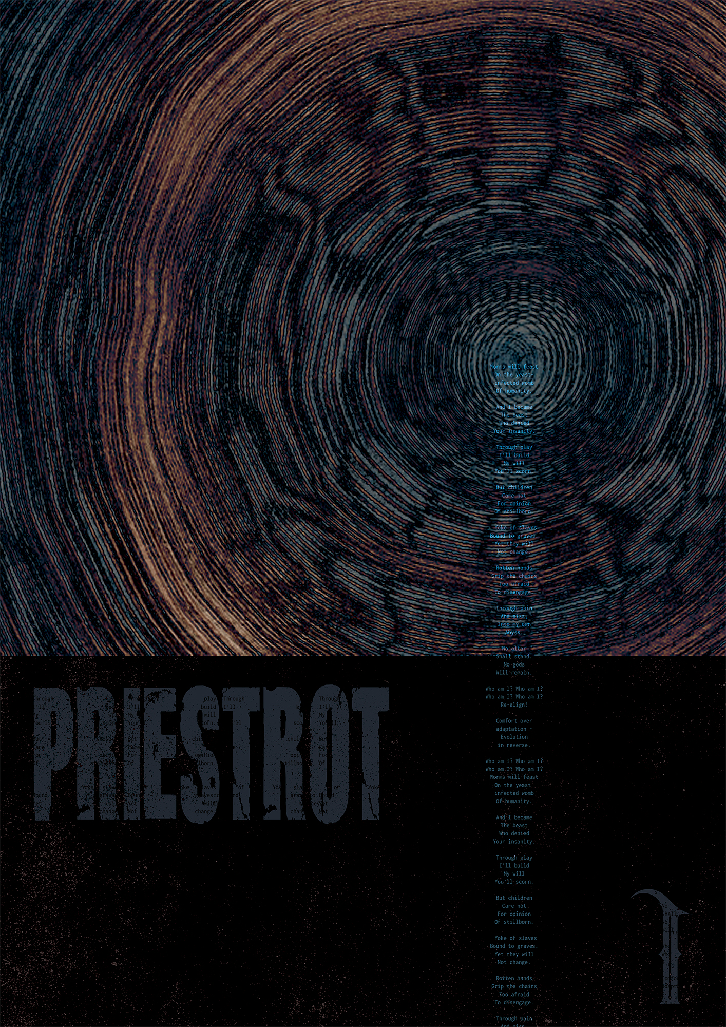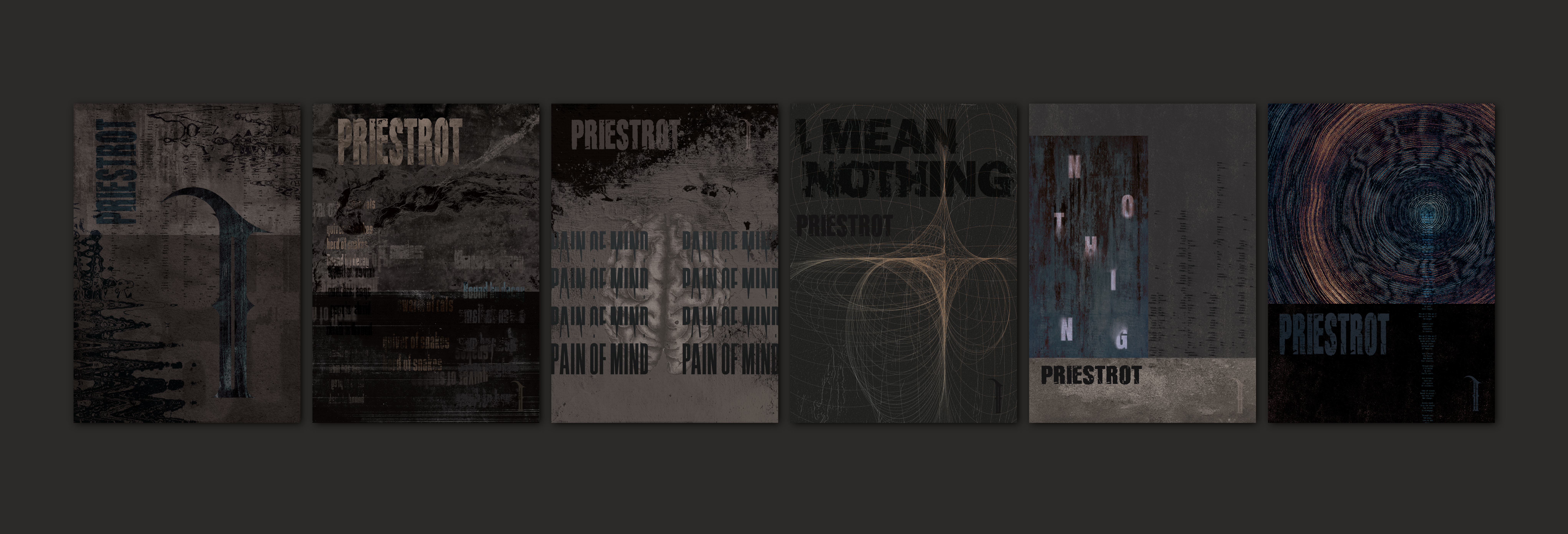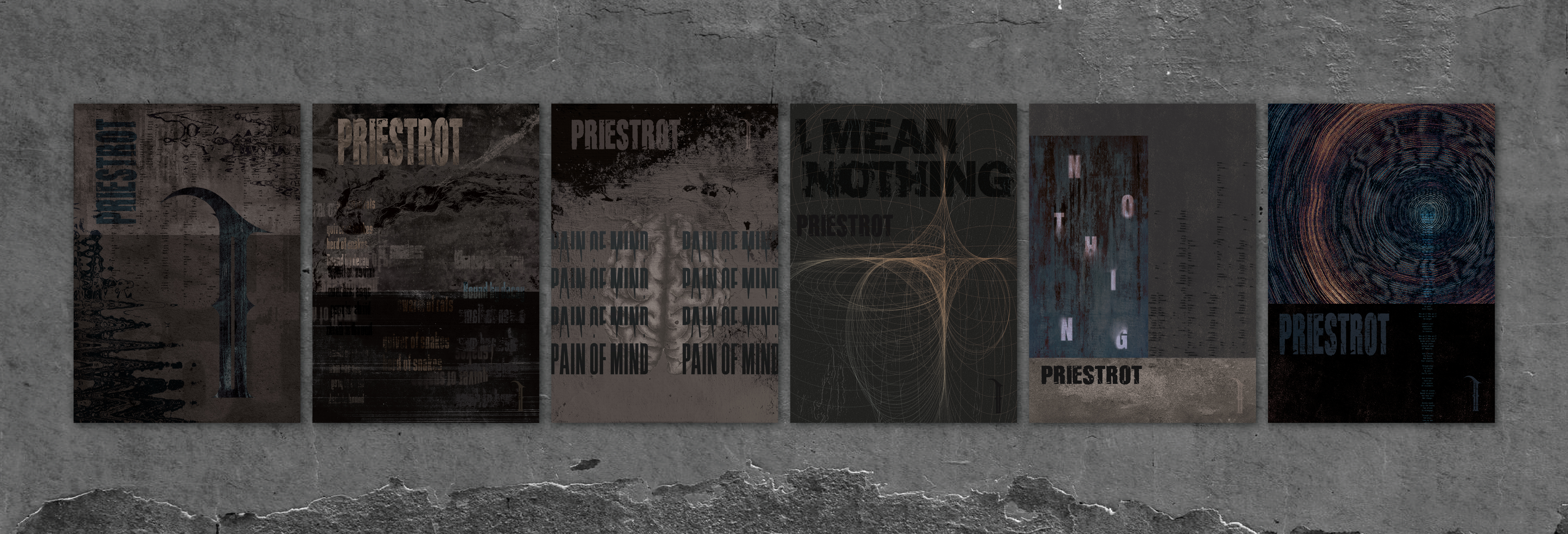 ![]() Paula Martinsone Priestrot This six-poster series is designed as a visual narrative that reflects the musical and ideological identity of the Latvian sludge band Priestrot. Each poster represents one track, emphasising its theme, sound, and lyrics. The visual works create deliberate discomfort using disruptive textures, expressive typography, and unconventional compositions. The series explores themes of existentialism, nihilism, and loss of identity, offering the viewer an emotionally intense experience that expands the band’s musical message beyond the boundaries of sound. The main concept of the series is a journey through the chaos of thoughts – beginning with a single impulse that rapidly unfolds into a chaotic mental process, gradually evolving through emotional intensity toward a moment of clarity. Each poster represents a stage in this inner progression, where disorder slowly transforms into a structured vision. |