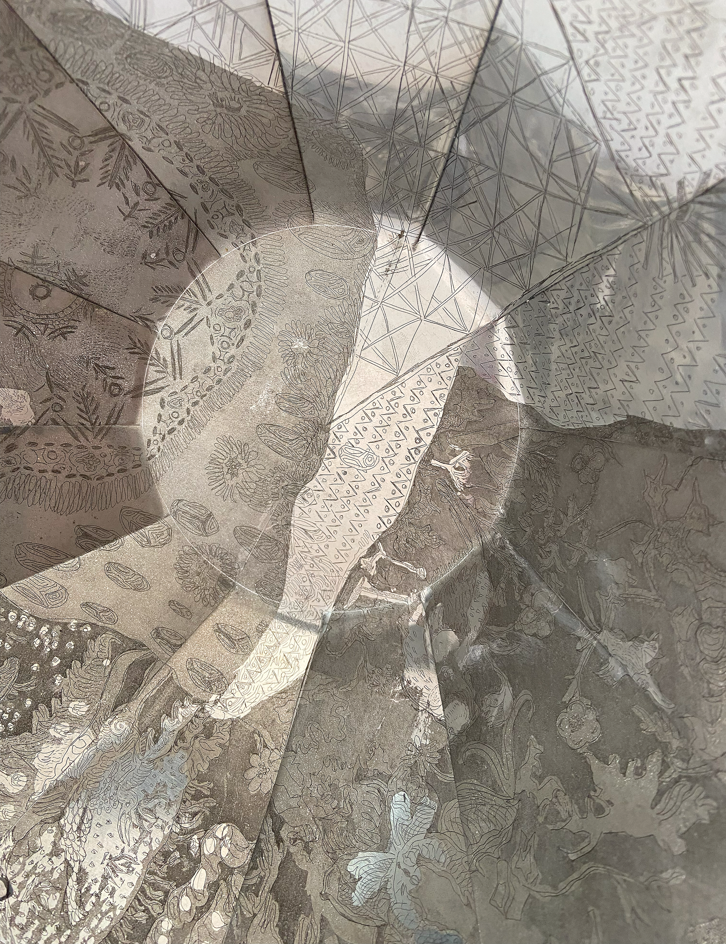 Repurposed aquatint etching. 10 x 26 cm Fully empty is constructed out of an aquatint etching I made. In the etching you can see textile ornaments from four cultures, of which I am a part of or which shaped me as a person in one way or another. These four cultures are: Lithuanian (my mother is Lithuanian), Pakistani (my father was Pakistani), British (I grew up in the United Kingdom) and Indian (I lived in foster care of an Indian household for a couple of years). The ornaments are etched in a way that combines both my own drawing style and the original authentic ones from the culture they come from. I think of this bowl as a symbol of the long period during which I suffered from an eating disorder. The bowl is empty, yet full of meaning. That period is important to me as an artist, since that is when I began to form my art style. |